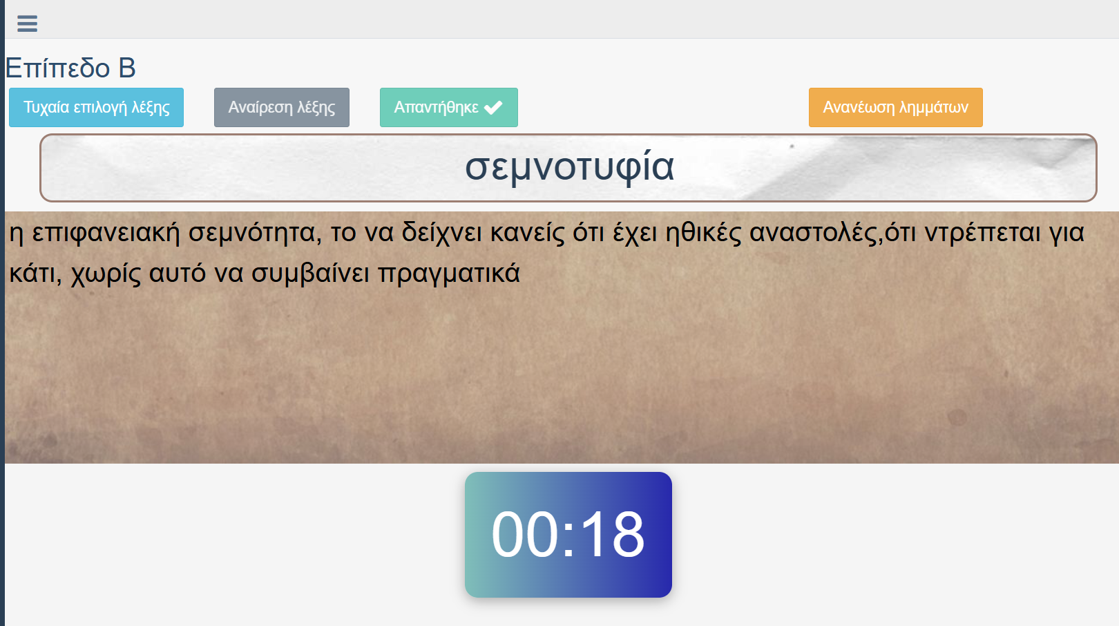 Η εφαρμογή του <<Ελλήνων...Λόγος>> προσφέρει ένα καθαρό και εύχρηστο ψηφιακό περιβάλλον για τη διεξαγωγή του γλωσσικού διαγωνισμού. Ο μαθητής ή ο διαχειριστής μπορεί να επιλέξει επίπεδο, να ξεκινήσει τη δοκιμασία, να εμφανίσει τυχαία λέξη και να παρακολουθήσει τον διαθέσιμο χρόνο μέσα από αντίστροφο χρονόμετρο.